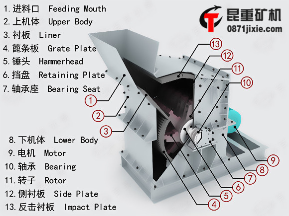 高效細碎機主要由上機體、襯板、篦條板、錘頭、擋盤、軸承、轉(zhuǎn)子、側(cè)襯板、反擊襯板等部件組成,高效細碎機為連續(xù)作業(yè)式設(shè)備。工作時,在電機的帶動下,轉(zhuǎn)子高速旋轉(zhuǎn),細碎機物料進入第一破碎腔破碎,與轉(zhuǎn)子上的板錘撞擊破碎,然后進入第二細碎腔進行粉碎,最后在出料口排出。