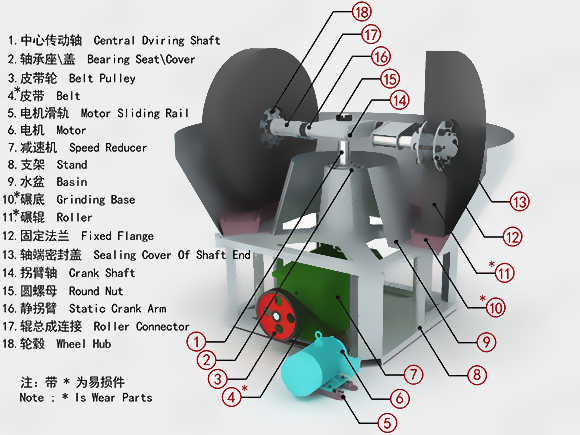 濕碾機主要通過對原料的攪拌、破碎、滾壓反復進行后達到水份均衡、礦漿細度均勻,從而提高生產效率。濕碾機主要由機架、水盆、碾輪、碾盤、電機、減速機等部件組成。