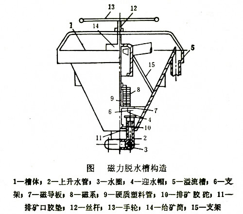 磁力脫水槽內磁場特性應在軸向和徑向都有梯度。在相同的條件下,軸向梯度大,徑向梯度小時,磁性礦粒下降的速度較快,對提高處理能力有利。反之,徑向梯度大,軸向梯度小時,磁鏈往往呈水平或近似水平狀態(tài)下降,所受到的上升水流阻力大,礦粒的沉降速度慢,影響處理能力,但此時磁鏈在下降過程中能受到較好的沖洗作用,對提高精礦質量有利,故應根據磁力脫水槽的不同用途來考慮磁性特點。