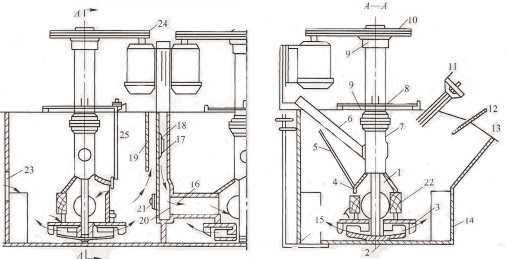 1、主軸;2、葉輪;3、蓋板;4、連接管;5、砂孔閘門絲桿;6、進氣管;7、空氣管;8、座板;9 、軸承;10、皮帶輪;11、溢流閘門手輪及絲桿:12、刮板;13、泡沫溢流唇;14、槽體;15、放砂閘門;16、給礦管(吸漿管);17、 溢流堰;18、溢流閘門;19、閘門殼(中間室外壁);20、砂孔;21、砂孔閘門;22、中礦返回孔;23、直流槽前溢流堰;24、電機及皮帶輪;25、循環孔調節桿。