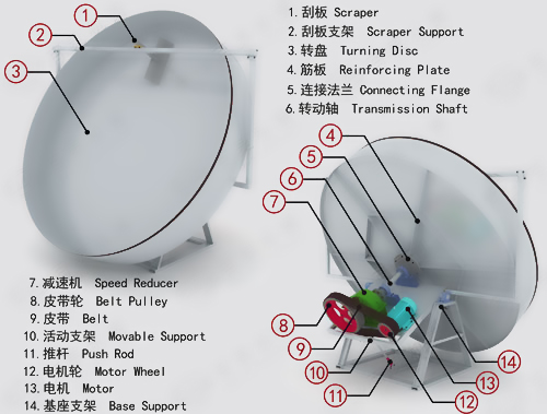 圓盤造粒機又稱成球盤,是由大盤、大齒輪、傳動部分、機架、底座、刮刀架、無動力刮刀等組成,圓盤造粒機具有造粒均勻、運轉平穩、設備堅固耐用等優點。