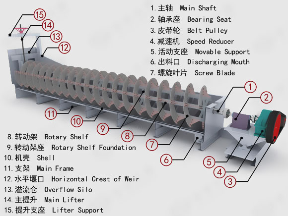 高堰式螺旋分級(jí)機(jī)采用將磨細(xì)后的礦漿從位于沉降區(qū)中部的進(jìn)料口給入水槽,傾斜安裝的水槽下面是礦漿分級(jí)沉降區(qū),螺旋低速轉(zhuǎn)動(dòng),對(duì)礦漿起攪拌作用,使細(xì)顆粒懸浮到上面,流到溢流堰處溢出。粗顆粒沉到槽底,由螺旋輸送到排料口作為返砂排出。溢流堰的位置高于螺旋軸下端的軸承中心,低于溢流端螺旋上緣。